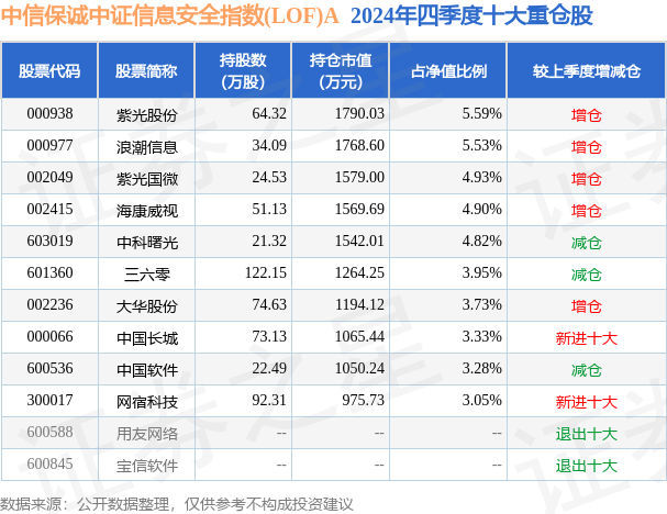 中信保诚中证信息安全指数(LOF)A为指数型-股票基金,根据最新一期基金季报显示,该基金资产配置:股票占净值比94.02%,无债券类资产,现金占净值比6.62%。基金十大重仓股如下: